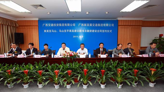 10月8日,集團(tuán)公司和廣西交通投資集團(tuán)公司來賓至馬山、馬山至平果高速公路項(xiàng)目融資建設(shè)合同簽約儀式在南寧舉行。自治區(qū)交通運(yùn)輸廳廳長潘巍、總工程師王劼耘;集團(tuán)公司董事長、黨委書記朱堅(jiān)和,總經(jīng)理李定倫,黨委副書記、紀(jì)委書記張友坐,副總經(jīng)理劉明洪,總會計(jì)師鄧遠(yuǎn)志,總工程師覃炳賢;交投集團(tuán)副董事長、總經(jīng)理、黨委副書記劉可,黨委副書記、紀(jì)委書記羅斯卡,副總經(jīng)理韋昌鴻、廉向東,及雙方有關(guān)部門、直屬各單位負(fù)責(zé)人參加了簽約儀式。