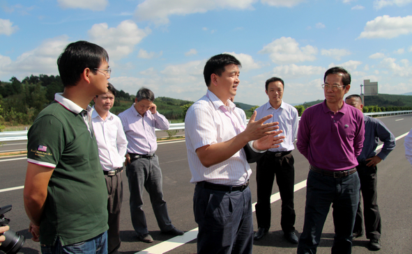圖1:自治區(qū)交通運輸廳廳長潘?。ㄗ蠖┱J真聽取項目相關負責人介紹項目建設情況,集團公司董事長朱堅和(右三)陪同檢查。