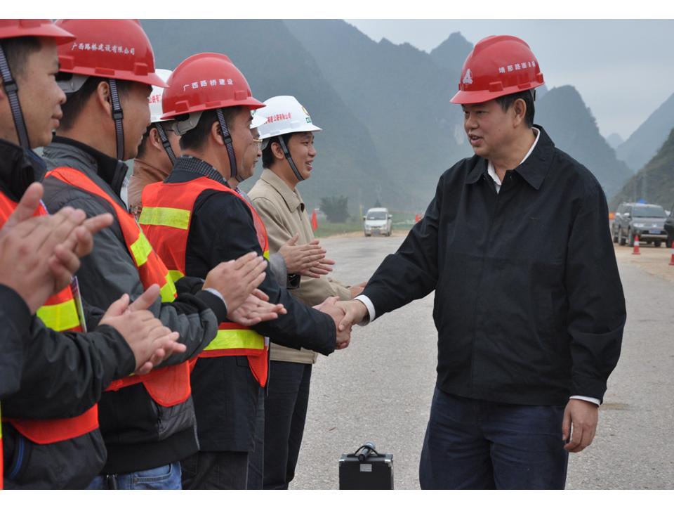11月22日至23日,自治區(qū)交通運輸廳廳長潘巍、副廳長梁毅分別蒞臨廣西路建公司靖那路、欽崇路、玉鐵路等項目檢查調(diào)研,了解項目旱季施工情況,親切慰問奮戰(zhàn)在施工一線的廣大員工,要求各項目把握好有利時機,堅決打贏旱季攻堅戰(zhàn),以優(yōu)異的成績促進交通建設發(fā)展。