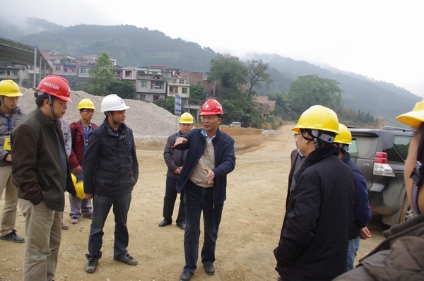 圖為集團公司總經(jīng)理李定倫(圖中)、總工程師覃炳賢(右二)在那平路項目施工現(xiàn)場指導(dǎo)工作