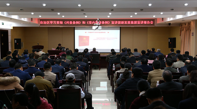 2017年2月24日上午,自治區(qū)學(xué)習(xí)貫徹《中國(guó)共產(chǎn)黨問責(zé)條例》《中國(guó)共產(chǎn)黨黨內(nèi)監(jiān)督條例》宣講團(tuán)到集團(tuán)公司舉行宣講報(bào)告會(huì),自治區(qū)紀(jì)委宣傳部部長(zhǎng)陳柳青作宣講報(bào)告,集團(tuán)公司黨委副書記、副董事長(zhǎng)、總經(jīng)理唐咸秋主持會(huì)議。