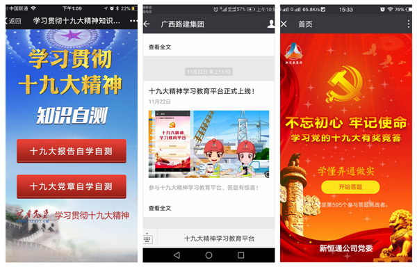 為了深入學習宣傳貫徹黨的十九大精神,營造濃厚學習氛圍,集團公司積極探索“互聯(lián)網+黨建”的新模式,在微信公眾平臺推出學習貫徹十九大精神知識自測、十九大精神學習教育有獎答題等平臺,吸引了大批黨員群眾自發(fā)上線答題測試,取得了顯著效果。