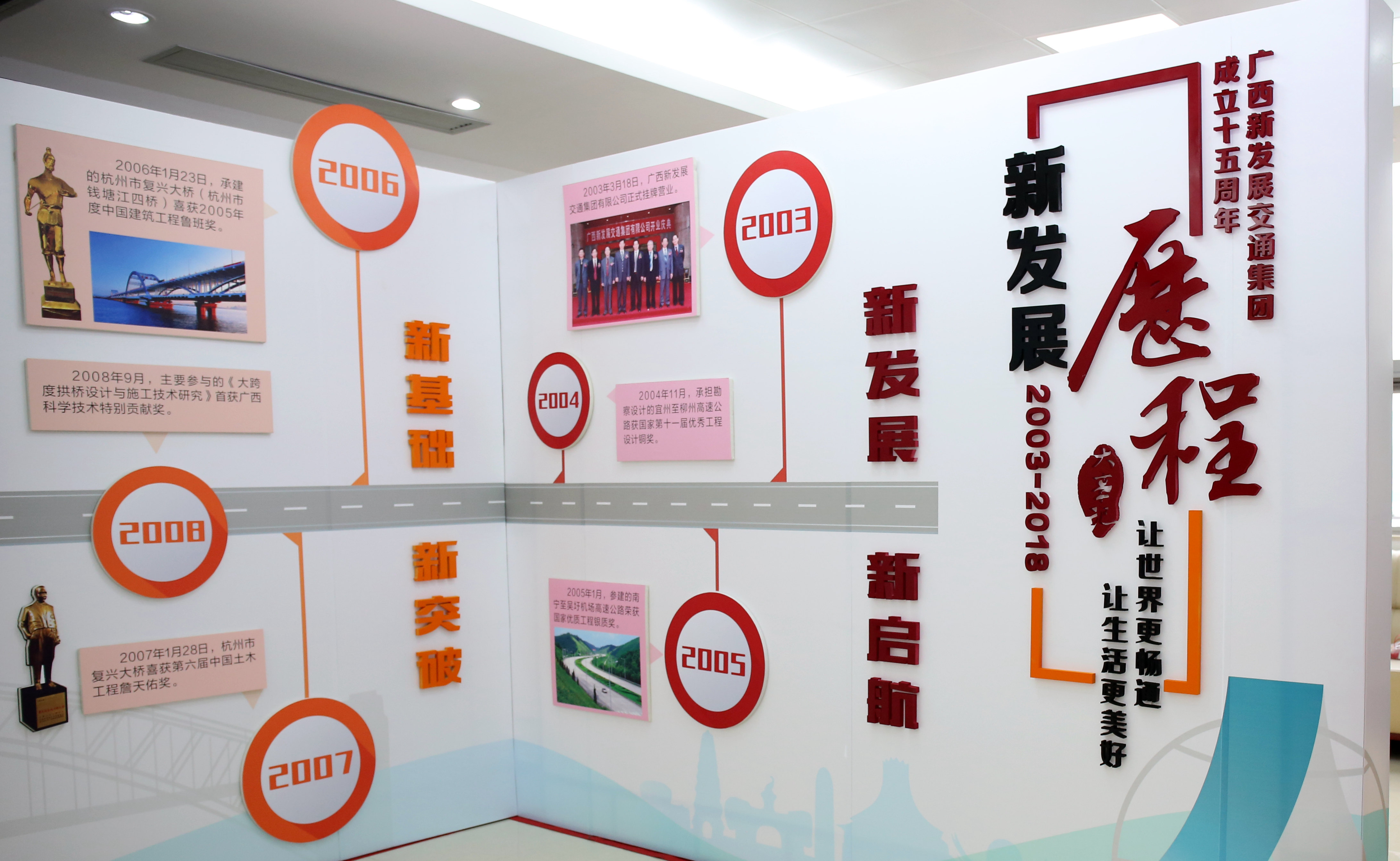在活動現場入口處,設置有一面企業(yè)發(fā)展歷程墻,展示了歷年來集團公司發(fā)展取得的矚目成績?;顒娱_始后首先播放了《新時代 新發(fā)展 新征程》——廣西新發(fā)展交通集團15周年紀錄片,對15年發(fā)展史進行了有聲有色的回顧。